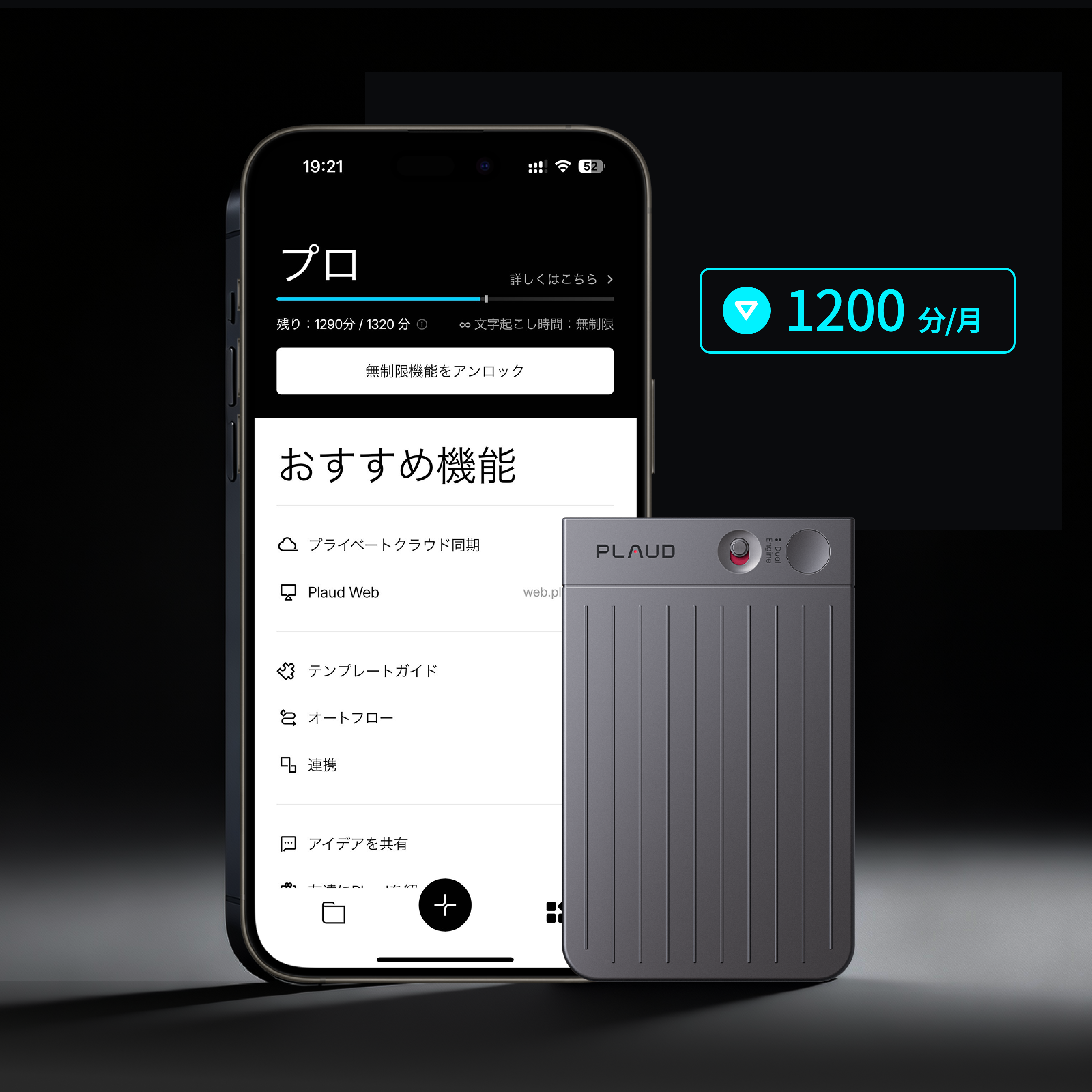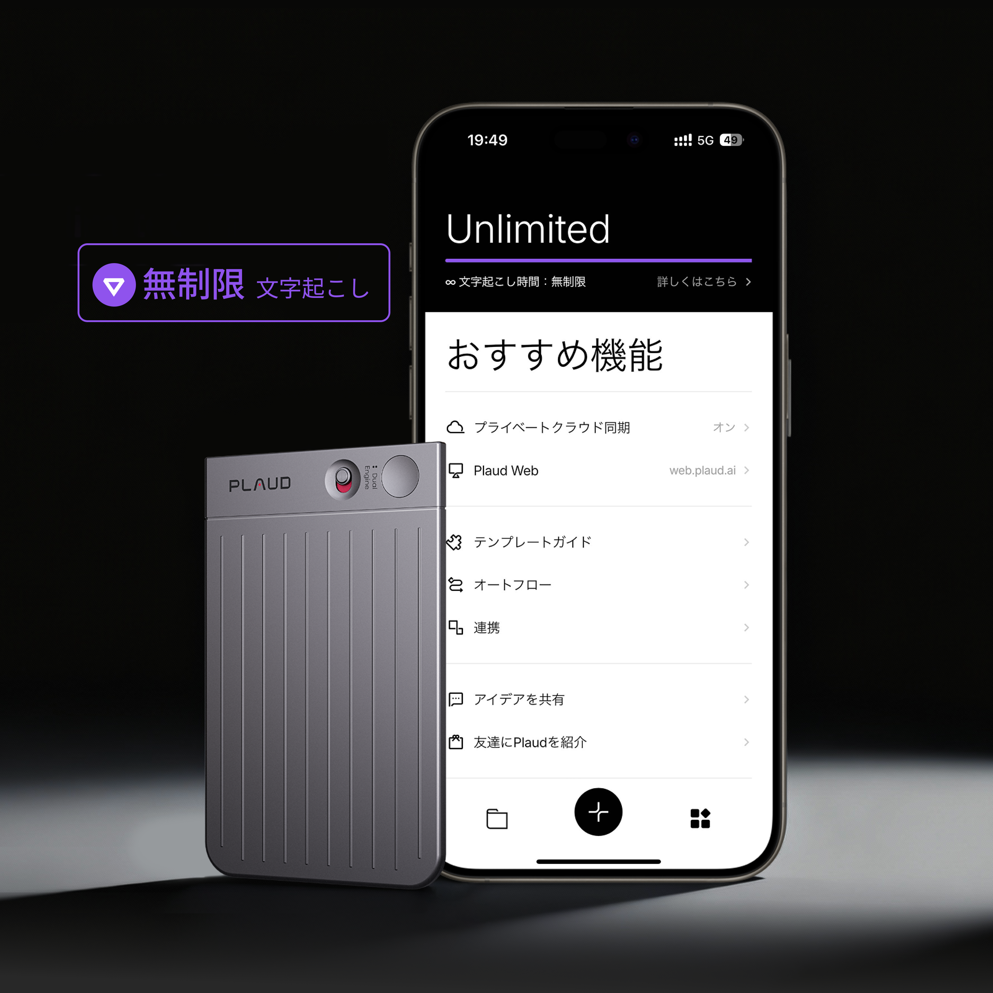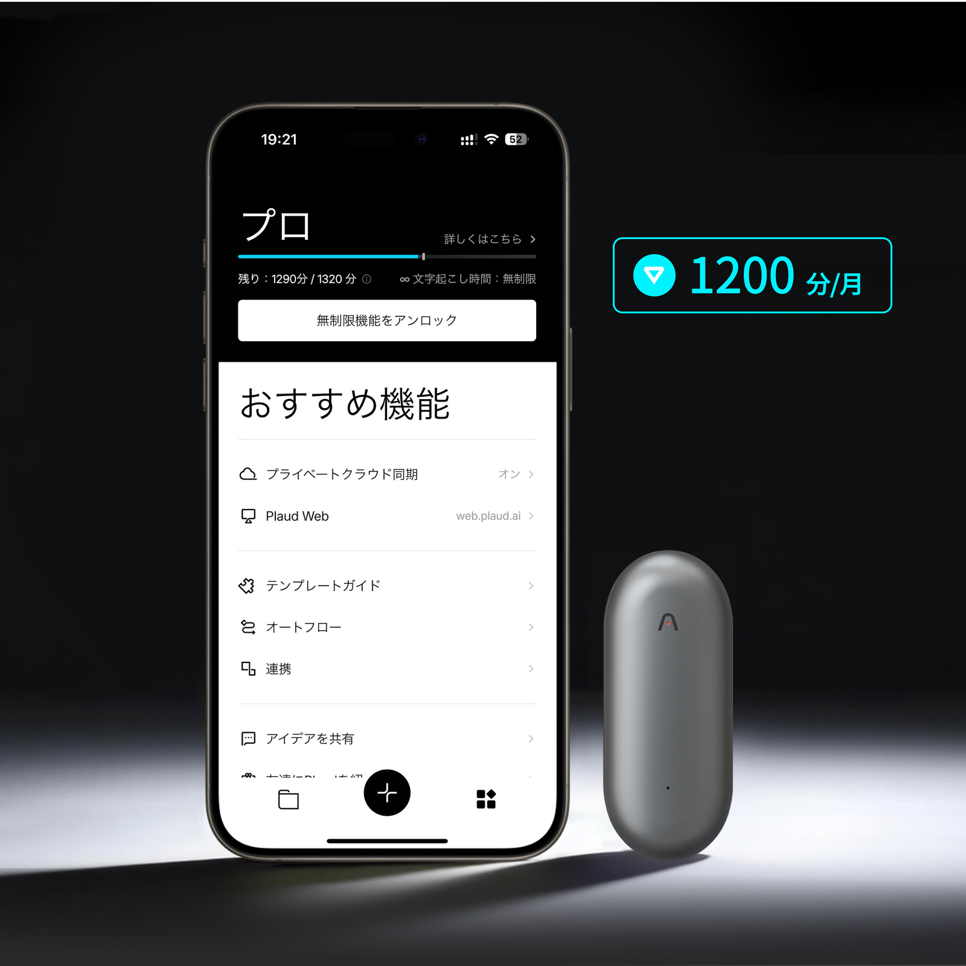 - 1製品購入でもらえる、2つの特典:ブラックまたはネイビーブルーのMagSafe対応ケース、月300分のAI文字起こし。