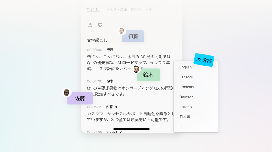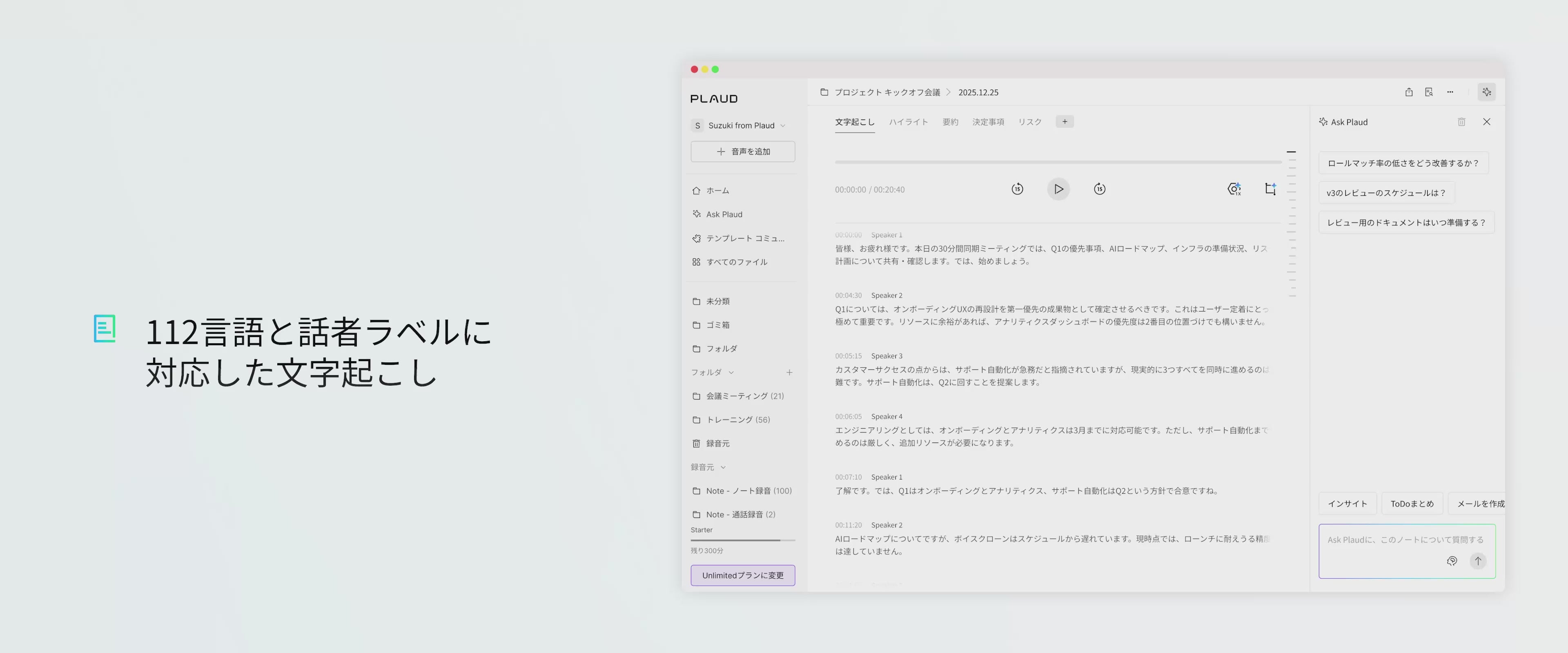 Plaud Desktopは、話者ラベルと業界向けに最適化されたカスタム用語機能を搭載し、112言語に対応した高精度な文字起こしを提供します。
