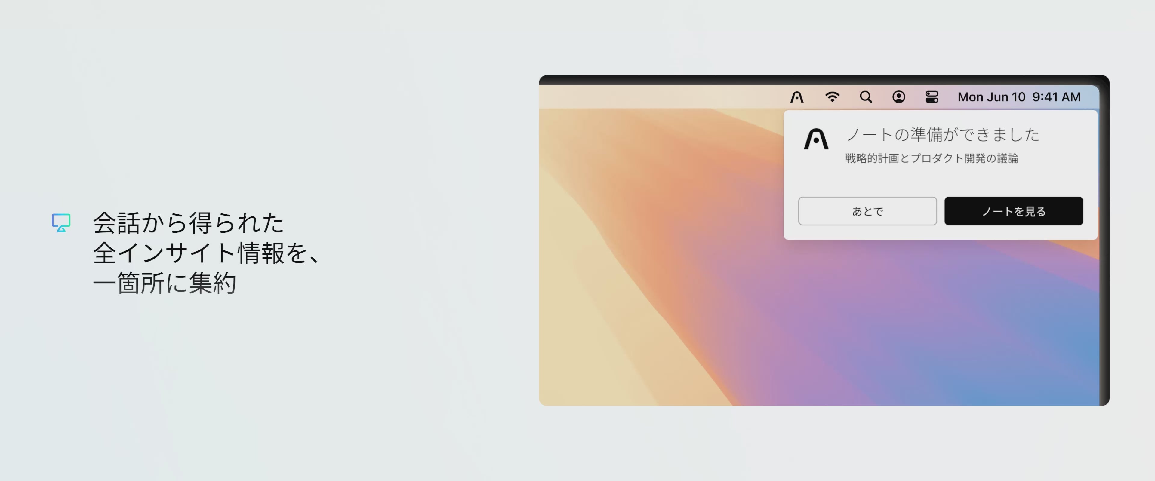 すべてのノート、文字起こし、アイデアを一つにまとめ、どのデバイスからも一瞬でアクセス。