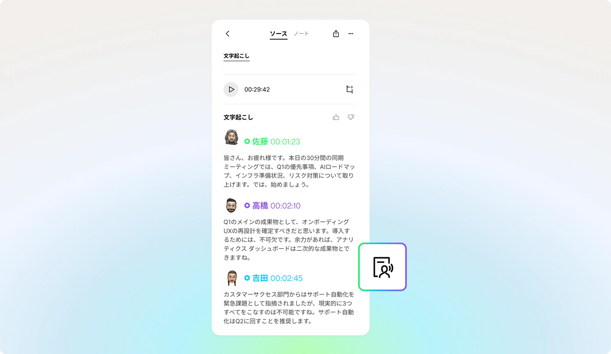 記録、文字起こし、要約、マインドマップを、保存・共有したい部分だけエクスポートできます。わずか数クリックで、27種類以上のフォーマットに対応したファイルを共有できます。