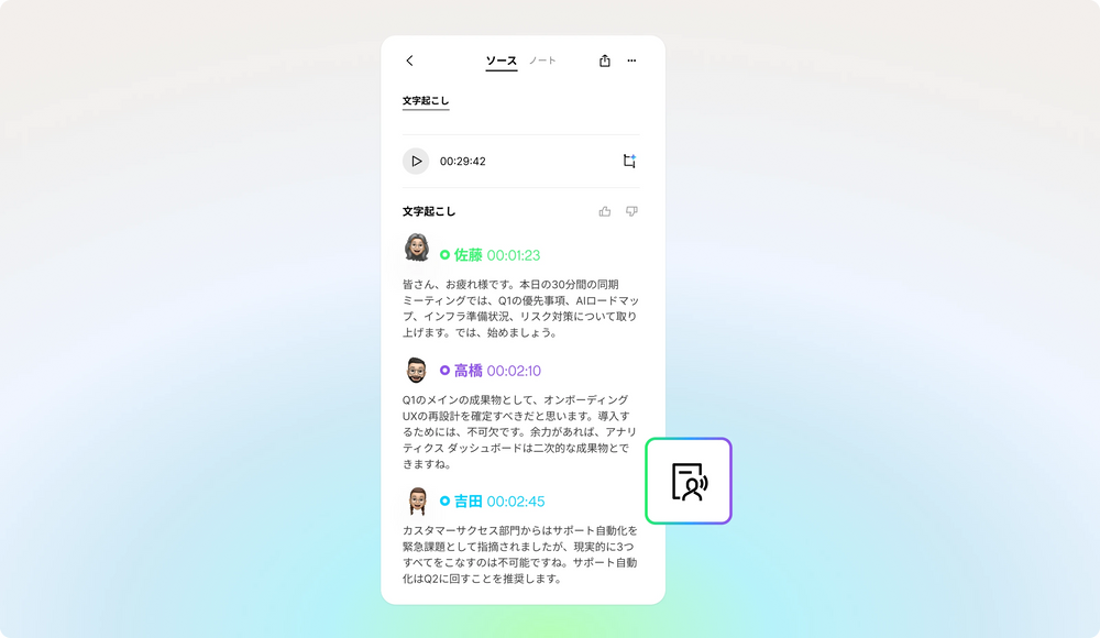 デュアルモード録音が更に進化。Plaud Note Proは通話か対面での会話かを認識し、自動的に切り替えます。シームレスな録音が可能なので、目の前の会話に集中できます。