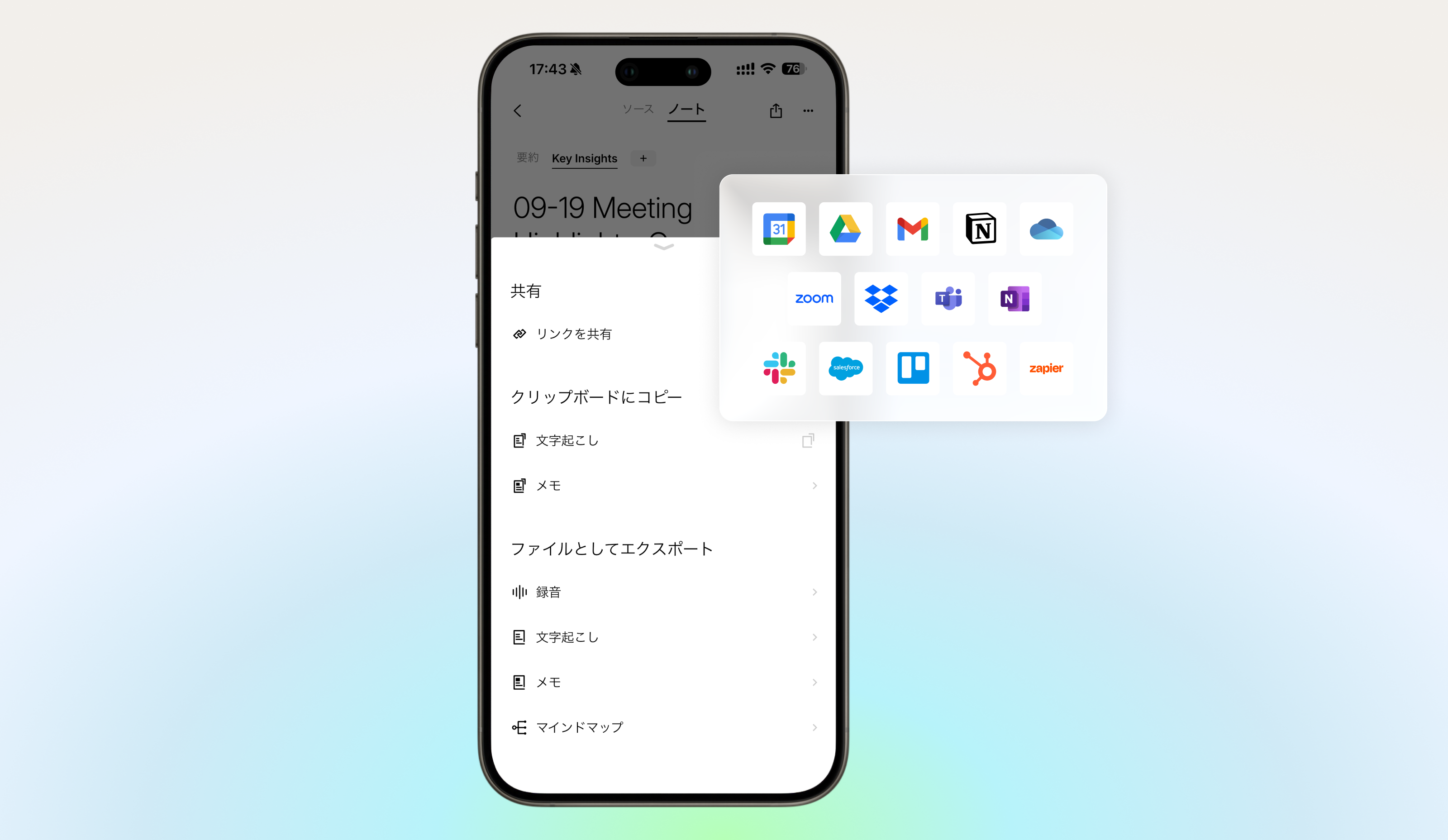 記録、文字起こし、要約、マインドマップを、保存・共有したい部分だけエクスポートできます。わずか数クリックで、27種類以上のフォーマットに対応したファイルを共有できます。
