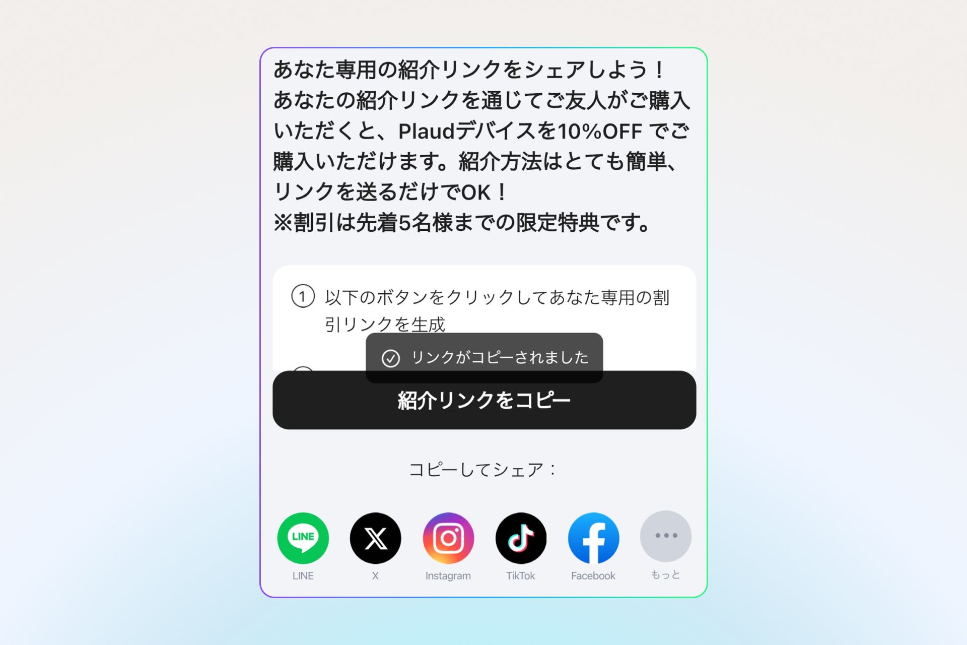 「紹介リンクをコピー」をタップし、コピーされたリンクを紹介したいお友達に共有。