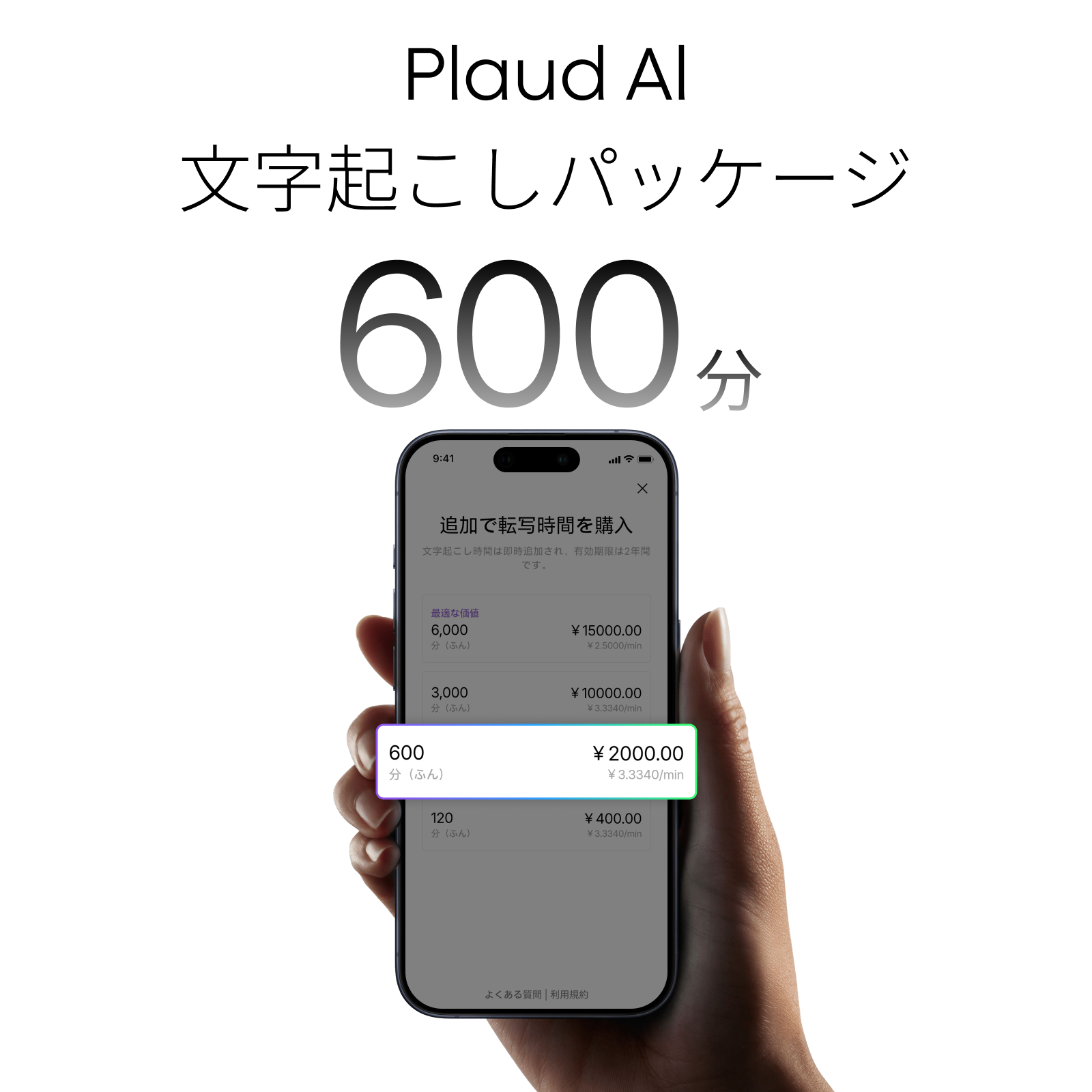 Plaud AIの各種プラン内文字起こし時間が不足した際に、追加でご利用いただける600分間の文字起こし時間パッケージです。
