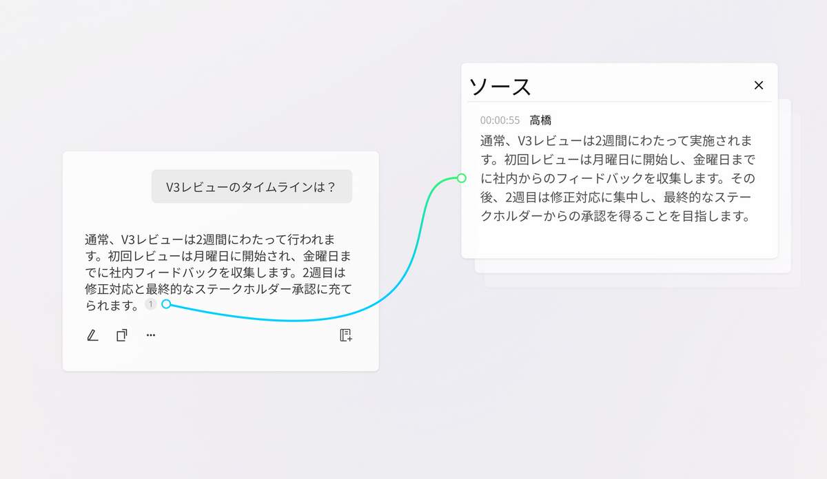 各回答は完全に文脈に基づいて作成され、ノートとして保存。いつでも元の情報に遡ることができ、同じスレッドで新しい質問を重ねていけば、継続的にインサイトを深めていけます。