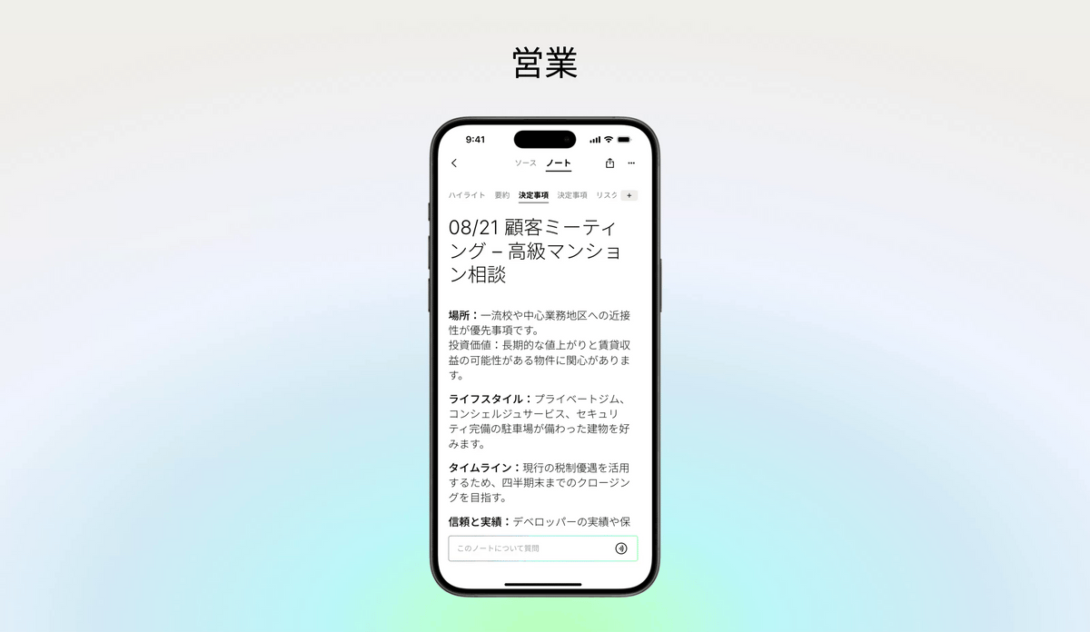 ひとつの会話から、複数の要約を自動生成できます。多次元要約は、営業向けのアクション項目、チーム向けのフィードバック、経営層向けの戦略概要など、役割に応じた要約を提供し、チーム全体の足並みを揃えます。