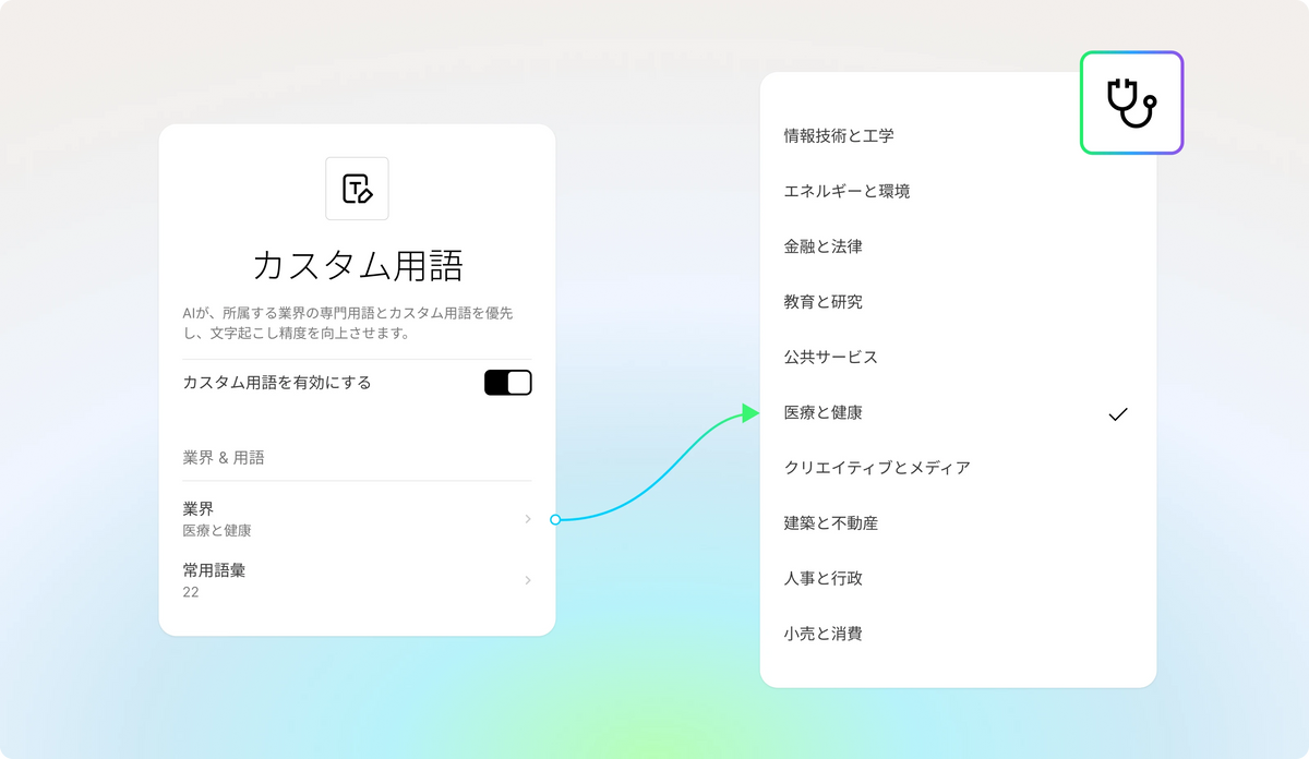 医療、法律、金融など、10種類以上の用語集が内蔵され、選択可能です。Plaudは、発音が似ている単語でも用語集内の単語を優先して文字起こしするため、専門分野でも正確で、分野に沿った文字起こしを実現します。