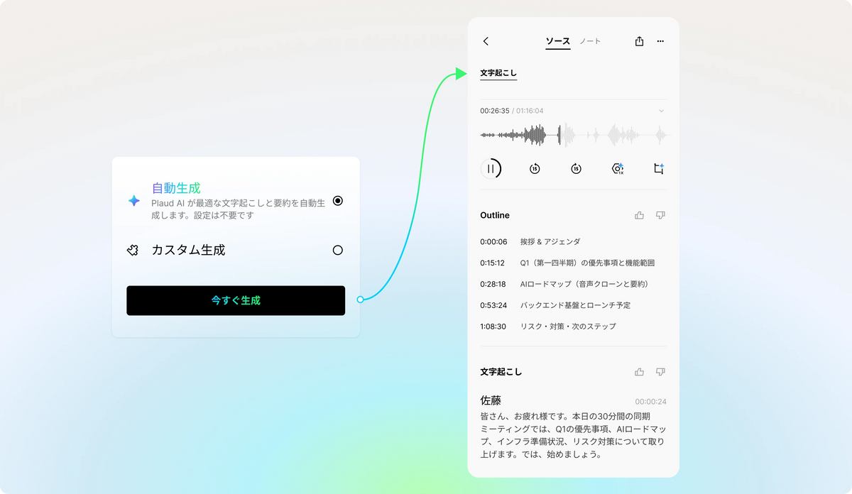 自動生成により、Plaudは言語や発言者をスマートに検知し、シームレスで正確な文字起こしを提供します。