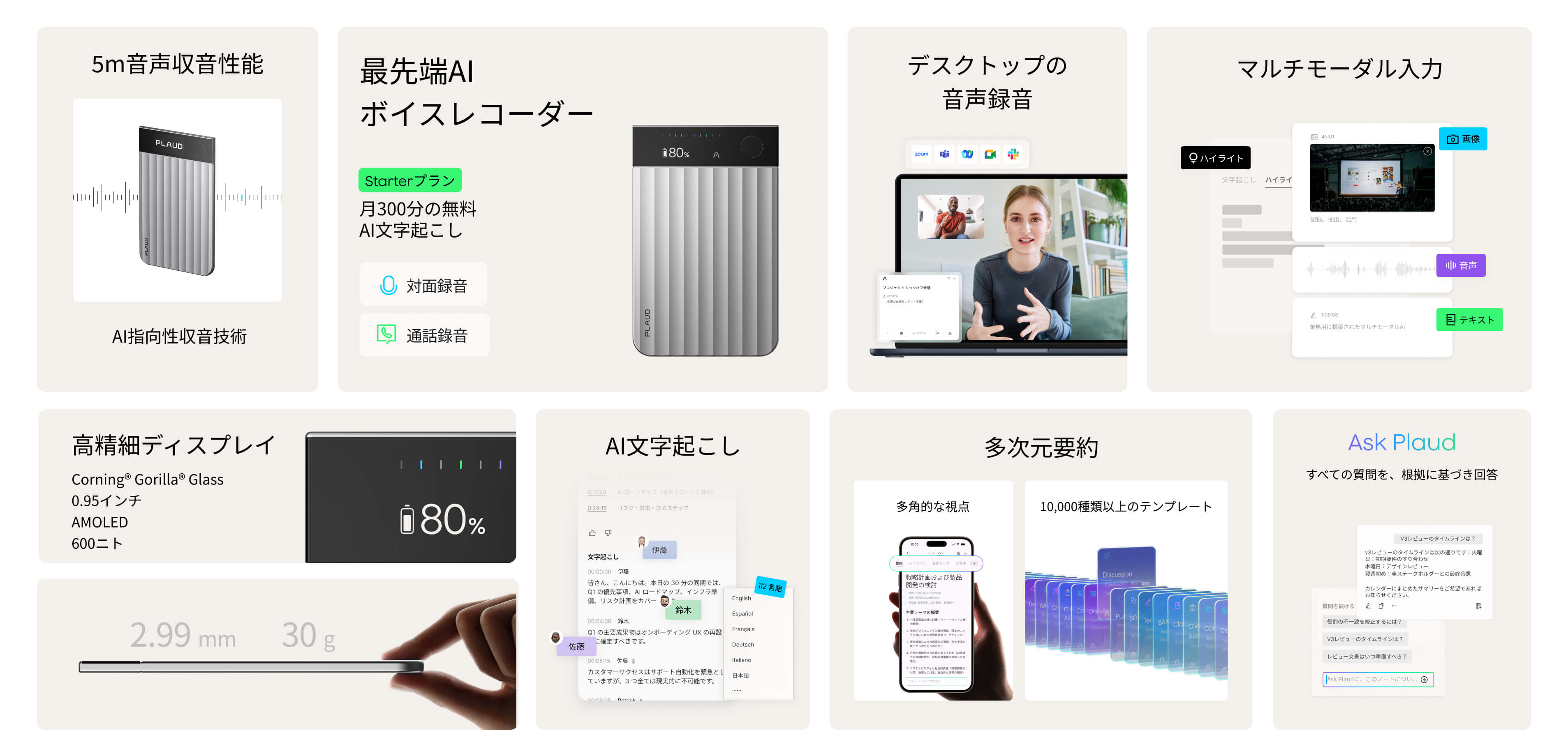 Plaudは、音声、タイプ入力したテキスト、画像、ハイライトから、情報を捉えます。先進的な大規模言語モデル(LLM)を搭載したPlaud Intelligenceがこれらを統合し、完全で整理された要約を作成します。これにより、ユーザー自身が最も重要と感じたことを汲み取った、常に明確かつ文脈に沿った要約を作成できます。